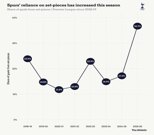 在缺乏稳定高位进攻输出的情况下,定位球已成为热刺的主要武器——这与波斯特科格卢时代截然相反。