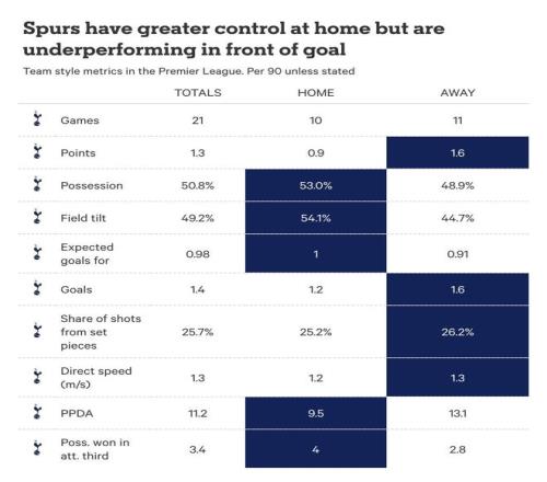 热刺在推进进攻方面的挣扎,也在其主客场表现的差异中起到了作用。
